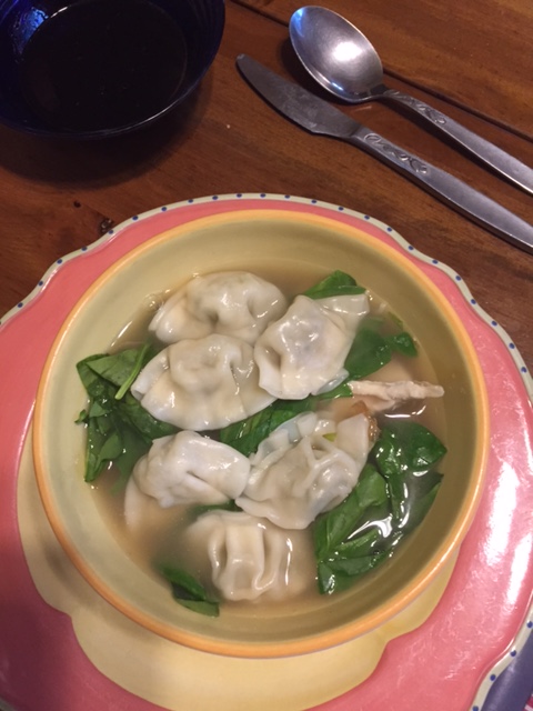 A little while later while pondering dinner – I am trying to empty the overstocked pantry and freezer – I decided to do something with a container of Pho broth from Aldi. I was going to add chicken and spinach, then I remembered the frozen wontons from Costco. While rooting around in the fridge there were the abandoned, beloved enokis.