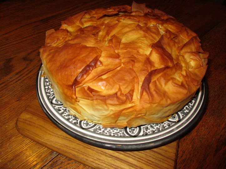 Every once in a while I find myself with a package of filo dough in my freezer (along with the aforesaid pie crusts). Mom taught me how to work with filo many years ago, as did the wonderful ladies at St. Constantine and Helen’s Greek Orthodox Church in Cleveland, Ohio. Every year, they make tons and tons of baklava, galatoborekos, and other sweets to sell at their annual festival. For a few years, when I worked in a small multi-ethnic museum Cleveland in the late 70s, I spent a lot of time in the church kitchens documenting their culinary know-how. [My galatoboreko (Greek lemon custard pie) won 4th place in the Monroe County (Indiana) Fair lemon pie baking contest a few years later! I still have the ribbon.]