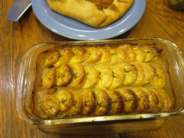 To close, an example of a successful meatloaf, in case you’re curious. Make your loaf, whatever basic mix you prefer (even the bread soaked in milk variety). Then take one or two ripe plantains. Slice them thinly and layer them in overlapping rows on top of the meat mixture. Bake as usual, 350 degrees F for one hour. I’ve done this more than once and it is really delicious.