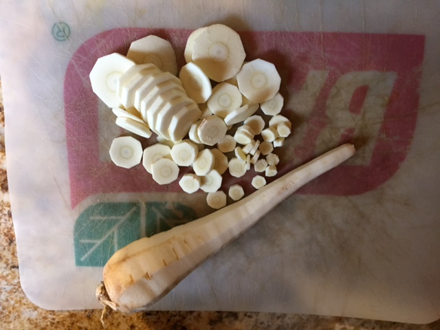 I love making a pot of chicken soup anytime, not just for Shabbat. These days, I only use 8 cups of water – we are only 2 in the house. What are my normal ingredients – chicken, of course, onions, celery, carrots, and parsnips. Parsnip is a cream-colored root vegetable related to parsley and carrot. It gives a nice tangy flavor to the soup.
