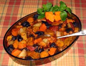 One more side dish on the Ashkenazi Shabbat table is tzimmes a mixture of carrot, sweet potato, dried fruits, sometimes with meat, cooked over a slow, low heat. This naturally sweet dish is often sweetened even more with golden honey. It also lives in popular culture as one of the Yiddish words that entered American vocabulary. Tzimmes used to frequently refer to a prolonged procedure, an involved and troubling business, as in the phrase, “don’t make a tzimmes out of it.” I rarely cook tzimmes, following my mother’s preference for Greek and Mediterranean flavors.