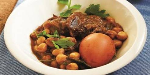 National variations of slow-cooking Sabbath stews include: • Iraqi hamin, or tebit, made with chicken and rice; • Bukharian bokla, with eggs and potatoes on top of beans, chickpeas, and lamb shanks according to Joan Nathan, or osevo/osh savo, made with rice and sometimes fruit, like prunes; • Tunisian and Algerian, tafina, Tunisians often add lamb’s feet and cardoons, a relative of the artichoke; • Alsatian Jews called them schalet included noodles & apples; • Hungary’s special version was called shalet, with goose, and sometimes stuffed goosenecks, and Hungarian paprika. It is so delicious and special that it is a national dish in Hungary, available at many restaurants.