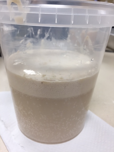 Pour 3-5 teaspoons of yeast (with a pinch or 2 of sugar in the mix) into 2 cups of lukewarm water. Stir til dissolved. We used a plastic carry out container and you could see the action of the yeast. In the future, I’ll do this at home.