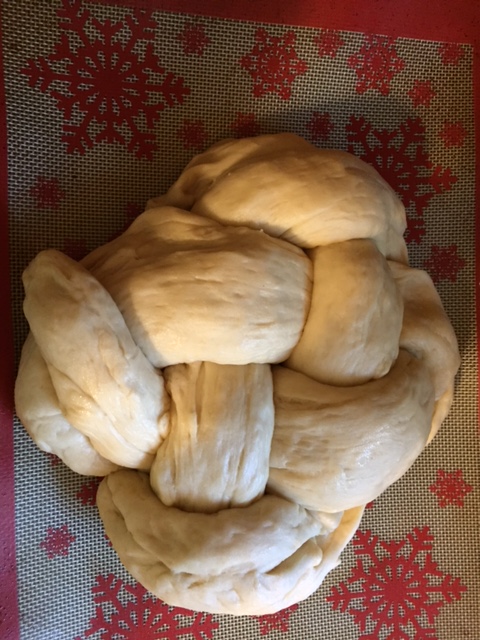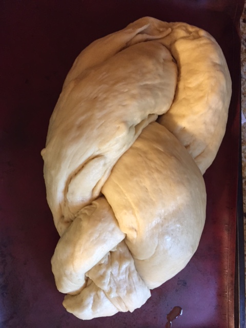 Once it’s risen, uncover, punch down the dough, moving out the air, choose how you want to braid it. You will have enough dough for 2 loafs. I made one the regular 3 braid and the second I tried a 4 braid. Instructions for all varieties are all over the internet and YouTube. I let mine raise for a second hour.