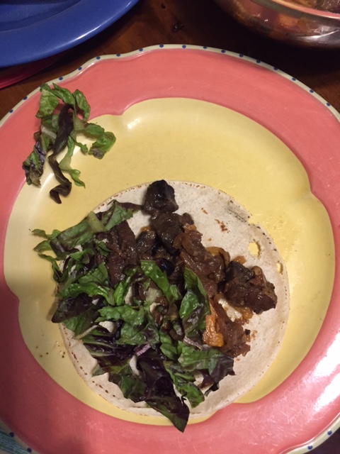 Dinner tonight was built around another Penn Dutch purchase. In the spring, they have loads of fresh lamb, including organ meat – awful offal, according to some. My husband and I enjoy this stuff and I have 2 packs of lamb hearts in the freezer. I hope you all don’t mind, it’s not to the taste of lots of people. I had recently saved a recipe for Moroccan-Inspired Lamb (Heart) Stew, thanks to The PaleoMom blog for the recipe. I did add mushrooms to the recipe, a nice bite.