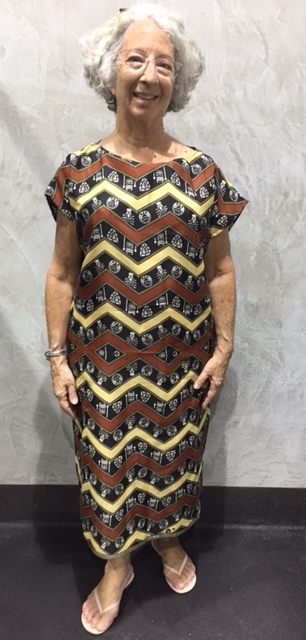 Back to the Angolan fabric, soon to be a dress. The other challenge it presented is the masks or faces in the pattern. No matter how you lay out the pattern, those across the torso are upside down. The faces on the bottom/skirt face upwards. I went ahead and cut it despite this strange situation. And, voila, a few hours later – ironing between each step – a new dress. Fun!