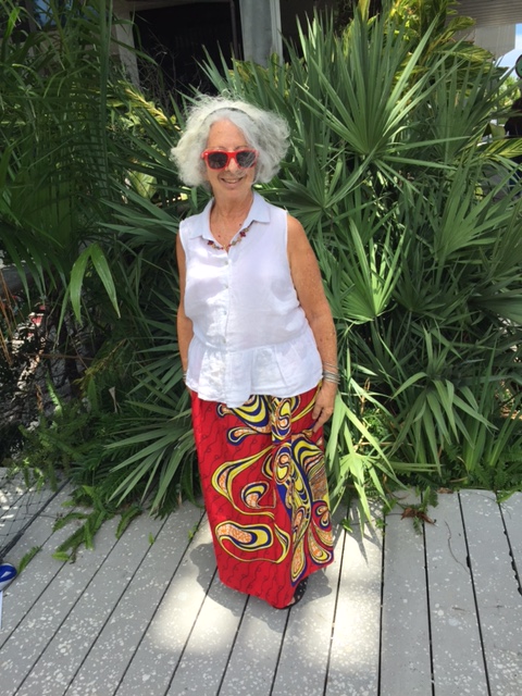 The second piece of material is bright red with a brilliant swooping yellow pattern running through it. I actually went out and bought a new skirt pattern for it. Another thing about me, I tend to wear longer skirts, so I needed length in this piece. Because skirts, no matter what pattern, tend to flare toward the bottom, the pattern did not work on the fabric. What to do? My mother was an amazing seamstress. But she was not a pattern maker; I never learned that skill.
