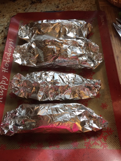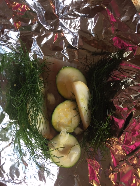 Last night we invited friends over to share the waiting and pass the time together – the hurricane wait dinner. I chose to make a fish en papillote (though I used tin foil instead of parchment paper) using a Pacific rockfish, thanks to Aldi. By the way, the new Trader Joe’s down the street put up their new hurricane barricades (like several other local businesses and the theater where I usher) and closed til the all-clear is sounded next week.  Better to be prudent and prepared in this season than sorry.