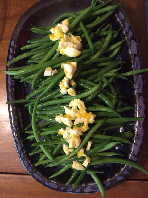 Accompanying dishes were a kale salad (from COSTCO) and pan fried little potatoes. I sliced them in half, boiled til soft, then threw then into a pan with a little olive oil and  a sprinkling of salt. In the potato water, I blanched some lovely string beans and hard boiled an egg  to top the beans along with an aioli.