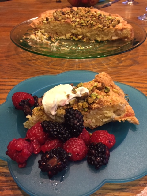 I realized I had no dessert and remembered having seen recipes for olive oil cake. I used Martha Stewart’s recipe – it has no dairy (remember, my husband shies away from most dairy, and I don’t keep milk in the house). The batter was kind of thick, but nonetheless, into the oven it went.  Not bad for a first try.  I topped the cake with pan-toasted and chopped pistachios nuts and served it with beautiful, seasonal berries and some crème fraiche from a previous dinner –   https://www.marthastewart.com/1530508/lemon-olive-oil-cake. Give it a try.