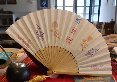 At the trade show I attended a week ago in Las Vegas, the Korean Tourism Organization (KTO) had a large display at which many different conference venues around the country were represented. Koreans are great for encouraging visitors to try their hands at crafts. This time it was a white paper fan and a choice of stamps and colors to decorate it. I chose lovely flowers to adorn my fan.