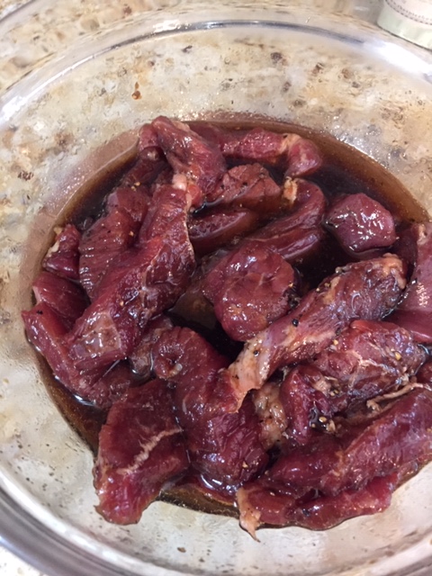 2 – Cut the meat into thin strips and marinate in white sugar dissolved in soy sauce. Then stir fry quickly.