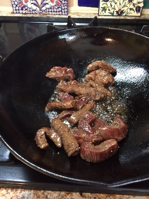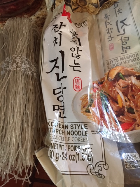 I could not resist the urge to use the book. So for dinner one evening this past week, with all the ingredients on hand I tried Japchae, a beef stir fry with uniquely Korean sweet potato glass noodles. First, I had to so some conversions from grams to ounces as the book is published for a European audience. It’s an easy task using my friend Google!