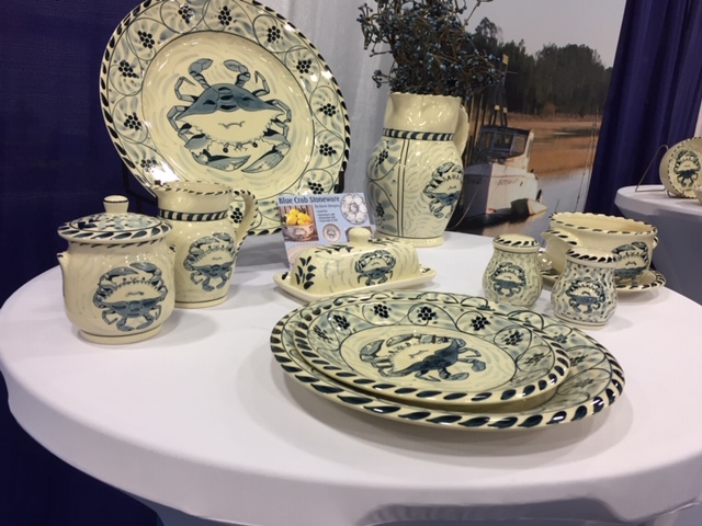 The USA Pavilion featured some state booths and other vendors. I had to try the Hatch chile wine at the New Mexico booth. Hatch chiles, special to New Mexico, are spreading nationwide. Actually, the night before the show, I used hatches in our dinner! There were Idaho onions, Michigan potatoes and apples. I learned that Michigan is the 3rd largest apple grower in the US. The Blue Crab Bay Co. from Virginia showed crab products alongside their special majolica stoneware designed by Jose Dovis.