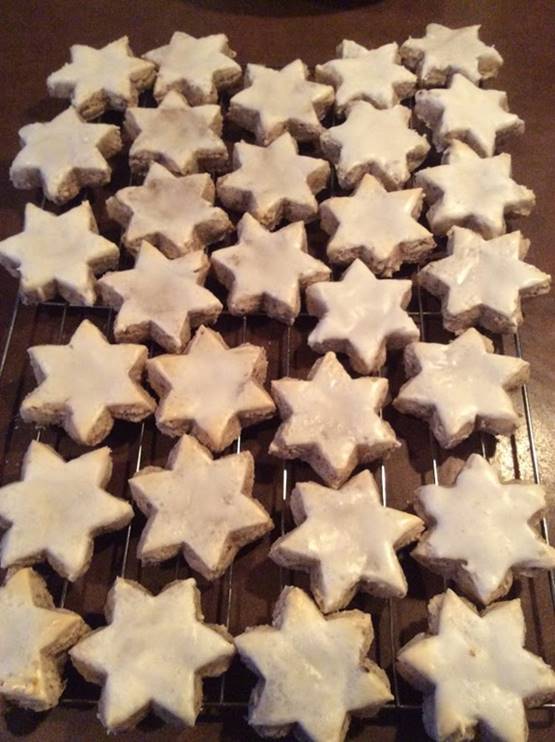 Other break-fast dishes vary from country to country. Dutch Jews broke the fast with coffee spiced with cinnamon, followed by a light dairy meal. German Jews enjoyed cookies called zimsterne (to the stars) or erste-steren (first stars), referring to the first stars which must be seen before breaking the fast. Central European Jews ate buns with cinnamon, nuts and/or raisins. In Algeria, children gave their fathers a sweet roll baked in the shape of his initial. The Jews of Rhodes broke the fast with reshicas or pretzel-shaped cookies.