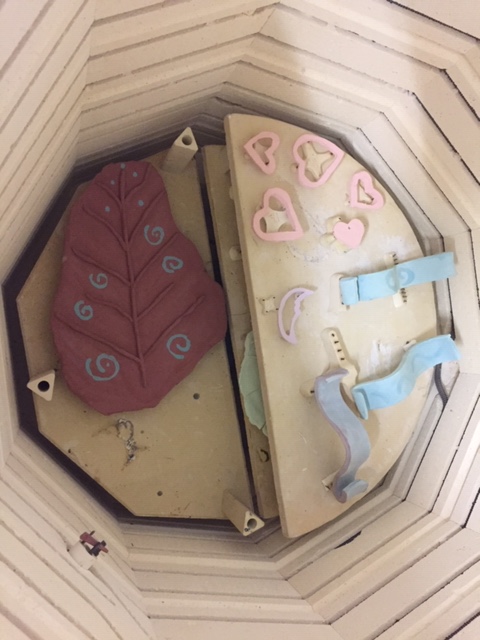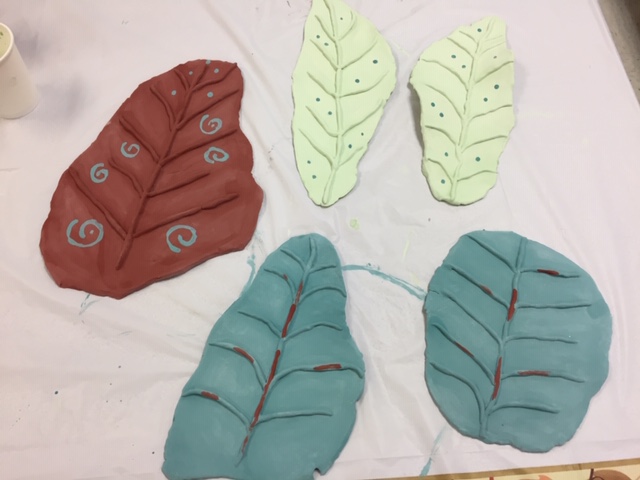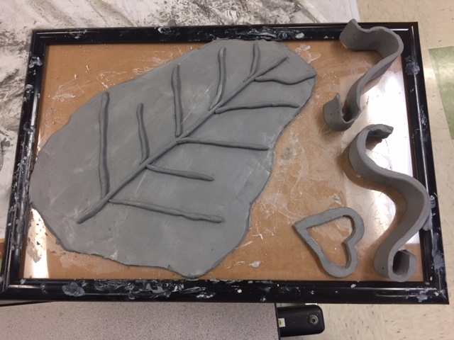 Working with the clay was a process. I’m good with processes and instructions, doing stuff step-by-step. First, I had to strenuously roll out pieces of clay to make my shapes free-form. We worked on tables with benches attached, e.g. picnic tables, covered with slippery plastic table clothes. They were suitable for sitting and painting molds. Rolling out tough clay was another story. First, was there a rolling pin to open the clay? No. Our really good instructor did not have an alternative. Is there a spray can? I asked. Yes, an aerosol can materialized to fill the place of a rolling pin. It worked, just barely.