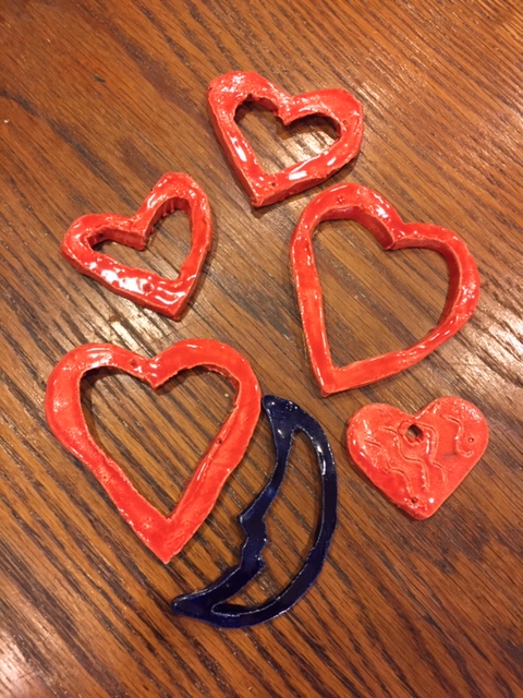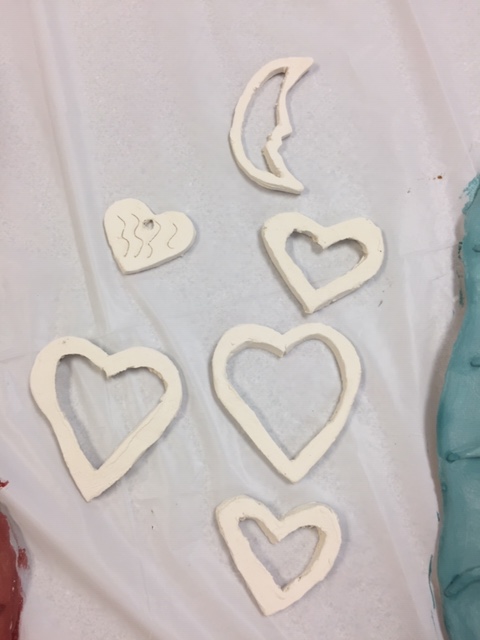 I had already started imagining other stuff I could make … One of the additional ideas that crept into my head was to combine ceramics with jewelry. I brought in a selection of cookie cutters on the second day – hearts and a moon. The resulting pieces are sloppy – my patience had worn thin. I should have been taken more time and care with finishing them. They might make pendants one day or maybe a collage with buttons.