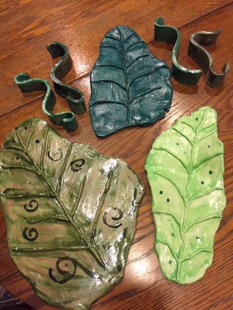 Along with my “jewelry pieces,” I ended up with five leafs of various sizes (a sixth broke in the first firing, perhaps a sacrifice to the kiln god) and four curlies. I’m not so crazy about the glaze colors, but as with the entire endeavor, I was working with what was on-hand.