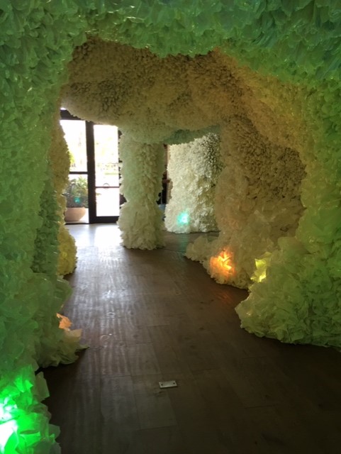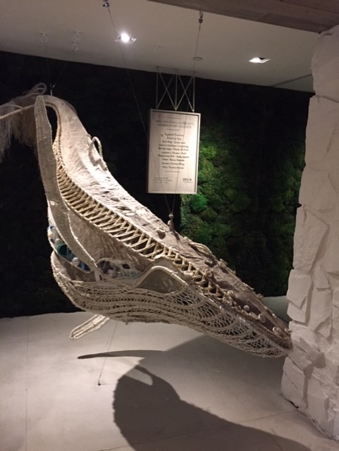 Tucked into one end of the cave an evocative sculpture of a whale made from detritus (trash, in other words) filling our oceans is suspended.