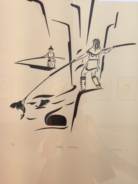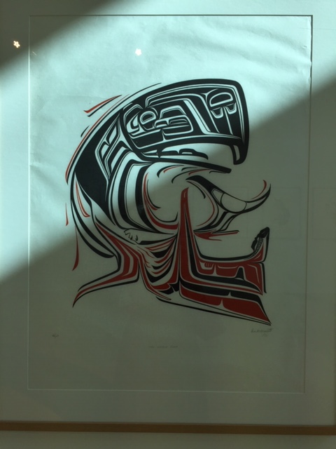 Returning to the car, we walked past Collins Park where the annual exhibition of outdoor sculptures was in process of being installed. Our destination was the nearby public library. There, an on-going, unrelated exhibition of silk screens from the library system’s extensive permanent art collection was displayed. Artwork by six artists from the Gitxsan, living in British Columbia filled the small space in our local branch library. Yet another privilege to see such excellent work from the other side of the continent.