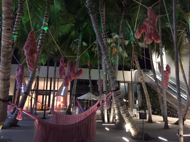 It was time to return home, with a slight detour. The 1 Hotel South Beach hosts Art Week installations like other hotels. Our friends from yesterday’s Progressive Brunch recommended we see it. The Polish artist Basia Goszxynksa’s Rainbow Cave is an immersive construction of plastic bags wedged into a corner between the lobby bar and Habitat restaurant.