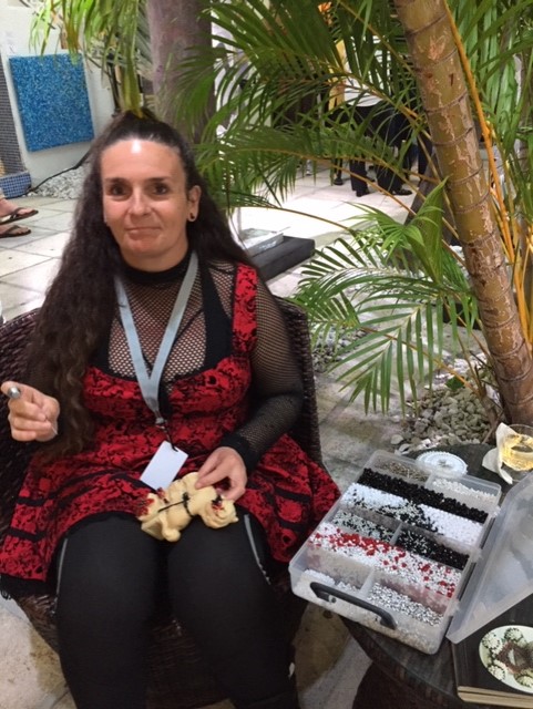 Another artist, working in quite another medium was Argentinean Marisa Dominquez at the AC Contemporary Art room. She was seating in the courtyard working on another “Little Treasure” though some of her intricate constructions are quite large. It reminds me of our pieces by the late Cherokee artist, Roberta Wallace.