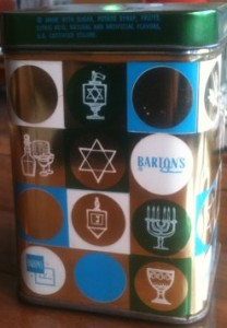 Candy companies like Barton’s sold hard candy in tins decorated with symbols of the holiday. Another company turned Maccabee soldiers into a Hanukkah version of Christmas tin soldiers, appealing in the form of translucent and shiny made barley sugar lollipops in a rainbow of bright colors.