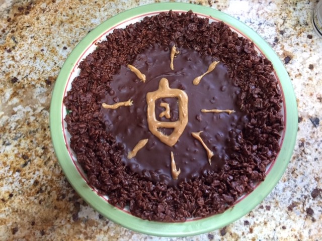 Melt the chocolate over a double boiler, add the peanut butter, stir til smooth. Take off the fire and carefully mix in the sugar, work out all the lumps. Add about 2/3 of the mixture to the cereal – mix until it’s all covered, no cereal color showing. Carefully line a pie pan with the cereal mixture (bottom and sides in an even layer). Add the remaining chocolate-peanut butter mixture and refrigerate. You can decorate as you’d like – the original recipe called for a spider web – Halloween after all. Daughter drew a dreidel. This was the sweet we took to a Hanukah lunch with friends.
