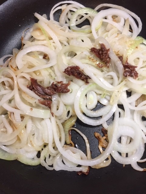 Stir carefully til the salty little fish are completely broken down and disappear into the onions. They impart a nice flavor and I use no other seasonings. Note: I was visiting with my neighbor who is a novice, adventuresome cook. She used a recipe for sauteing onions which included water and covering the cooking onions. This method will steam your vegetables and the end result is different. I do not recommend either of these if you are sauteing.