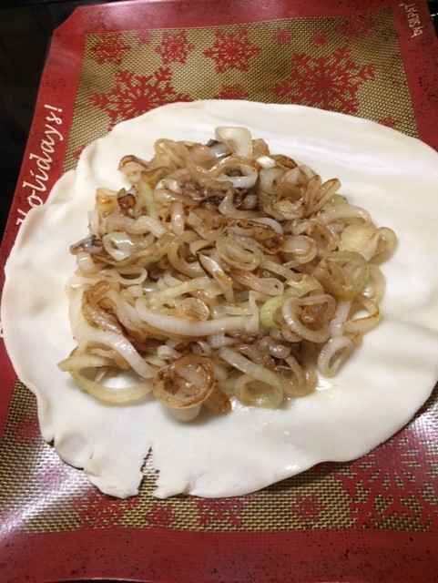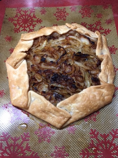 Open one pie crust. I use ready-made from the store. You can make your own crust if you prefer. Pile the cooked onion-anchovy mixture toward the center of the crust, leaving about a 2 inch border. Carefully fold in the border creating a round. Pop in the oven with the chicken for about 30 minutes. If the crust looks nice and crispy along the edges, it should be done.