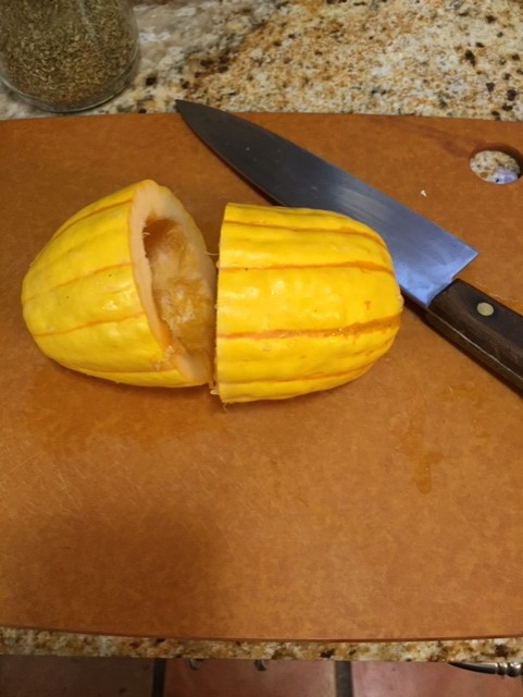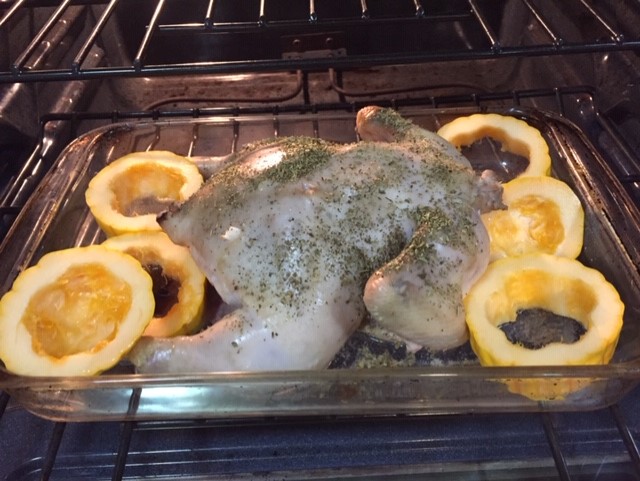 I had a small delicata squash in the pantry that was begging to join the meal. I cleaned the seeds out, sliced it in rings and put them in the roasting pan with the chicken. Very nice.