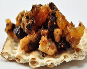 Haroset (clay) – a sweet spread of fruit, nuts, and wine; symbolizes the mortar and mud bricks used by the ancient Israelites to build the pyramids; it is one of most unusual foods prepared for the seder and was probably one of those appetizers from the Roman symposium. There are many, many variations to this dish and, of course, everyone thinks there is the best!