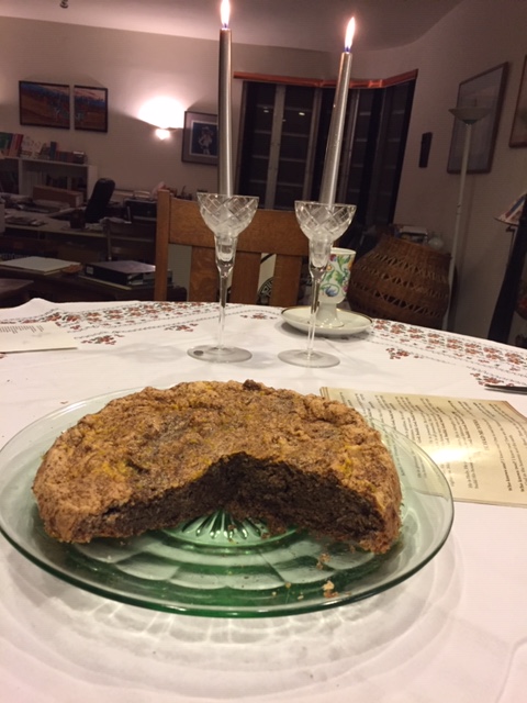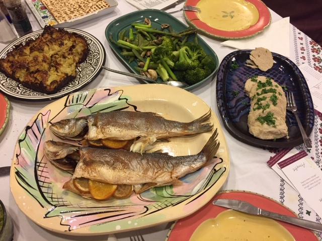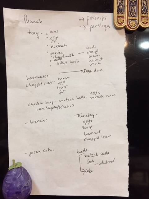 My menu is pretty simple and culturally mixed. For the seder plate, I needed to prepare my hard-boiled eggs and the haroset, the fruit and nut mixture symbolic of the mortar used to build the pyramids (or so we are taught as children). Next, the meal starts with some appetizers such as chicken soup, gefilte fish, the eggs. This year’s entree we’re having beautiful branzino, potato kugel, and fresh vegetables. Dessert is an old recipe, would you believe 1991, for a lemon pecan torte. The menu is part was chosen from ingredients harvested from the freezer because of limitations in the local supermarket.