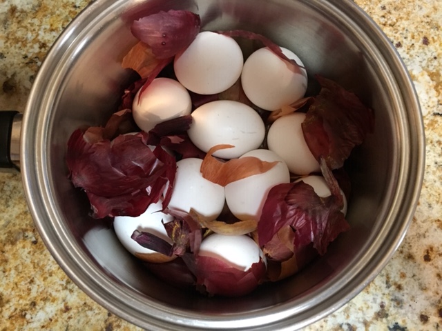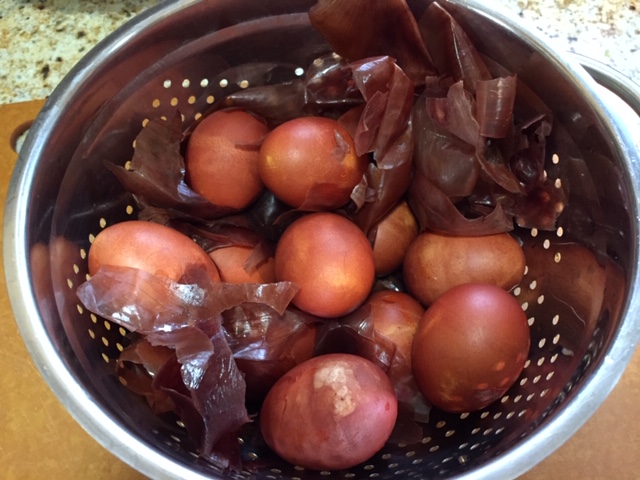 Day One. hard-boiled eggs – for the seder plate and an appetizers – first foods eaten after the lengthy recitation of the Haggadah, and often an ingredient in other dishes. Mine are in the Sephardic style or huevos haminados. The amazing brown color on the shell is achieved from nesting the eggs in onion skins while they boil. Some cooks bake them overnight in the oven for the same result.
