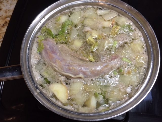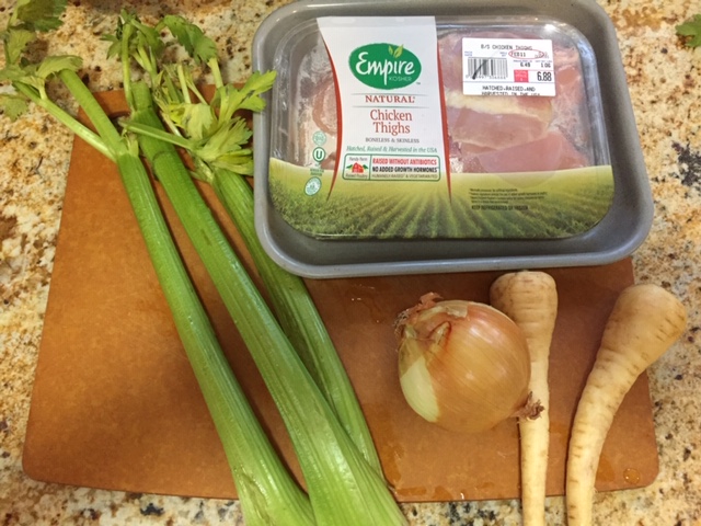 Next, chicken soup. I used some chicken thighs I’d had stashed away just for this purpose. I also used the chicken necks found in the depths of the freezer, waiting for just an occasion as this. First, sweat roughly chopped onions and celery in oil on the bottom of the pan. Add chopped parsnips to the mix. No carrots this year, but they are a usual addition. To this add the chicken parts and lightly brown, then about 8 cups of water. Skim off some of the foam from the chicken and add a nice bunch of fresh dill and fresh parsley and a handful of salt. Simmer for about one and a half hours. Take the chicken out; when cooled roughly shred and return into the soup. After lunch on Day Two I’ll make the matzah balls.