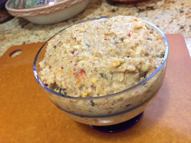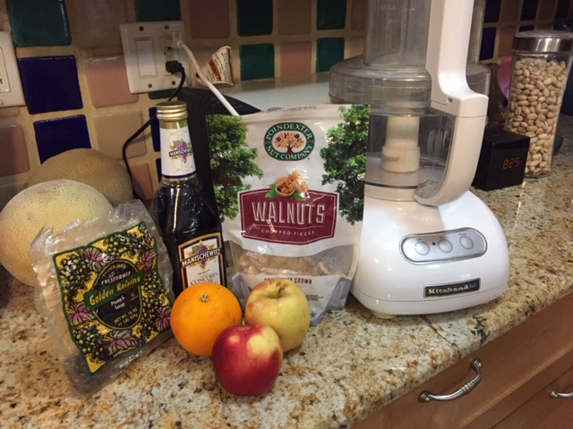 Haroset was next on the list. I use my mother’s “recipe,” nothing is written down. Rough chop two cored apples and one thick skinned orange, peel and all. Put them into the food processor with a good bunch of raisins and a bunch of walnuts. Give it a spin, then add some kosher wine, probably no more than 1/2 a cup. I use no measurements. Once it was done, I realized I should have soaked the raisins in the wine to soften them. Maybe they’ll marinate overnight (they did).