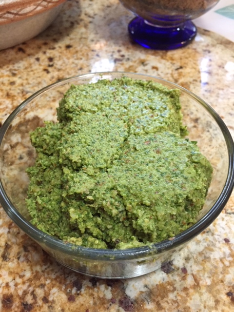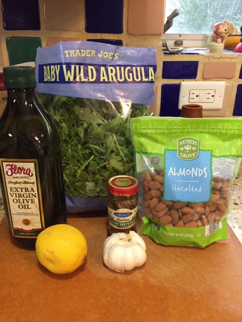 The food processor got its workout this day. Next, an almond pesto I’d seen on America’s Test Kitchen a few evening’s earlier. They proposed this sauce for salmon; I thought it might be nice on the branzino. Chop ¼ cup of roasted almonds with 4 rinsed and dried anchovies and 4 garlic cloves. Add 6 ounces of arugula, ¼ cup of lemon juice, ¼ cup of extra virgin olive oil, and some salt. Give it all a spin in the food processor. No cheese like in other pestos. It’s interesting. We’ll see if it’s a match for the fish. (It was good, but too heavy on delicate branzino, it will get eaten this week no doubt.)