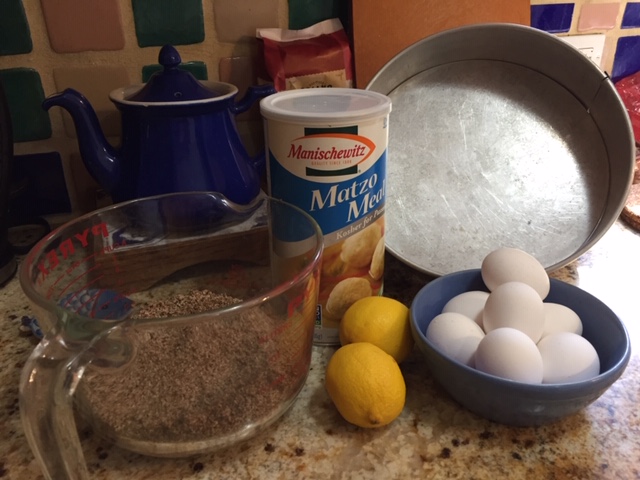 Heat the oven to 325 degrees, Fahrenheit, oil a 9” springform pan and dust with 2 tbsp of matzah meal. Whisk the egg yokes with the sugar. Stir in the pecans and the lemon rind. Beat the egg whites and lemon juice to stiff, not dry peaks. Stir ¼ of whites into yoke mixture, fold in remaining until mixed. Scrape into the prepared pan. Bake for 1 hour. Cool for 15 minutes