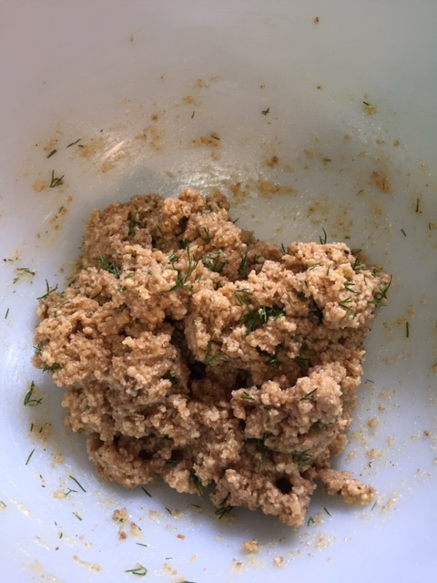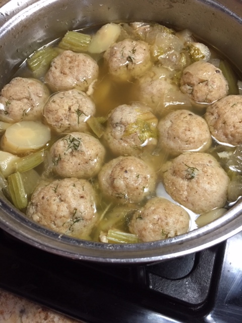 Matzah balls. I’ve always used the mix for this.* It’s so easy. Add 1 or 2 beaten eggs to the mix. Then add oil. This year we (Daughter helped with this one) added chopped dill to the mix. Let it sit for some time. Form into walnut-sized balls (I like them small) and drop into boiling soup. Voila, matzah balls.