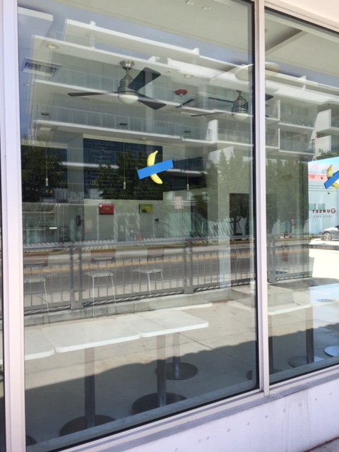 At the corner near the supermarket is a juice bar, closed for who knows how long. Our community made worldwide news in December during Art Week because of the “banana duct-taped to the wall.” Is it art? Why did it sell? Whatever! Great sense of humor at the juice bar and their contribution to the banana = art!