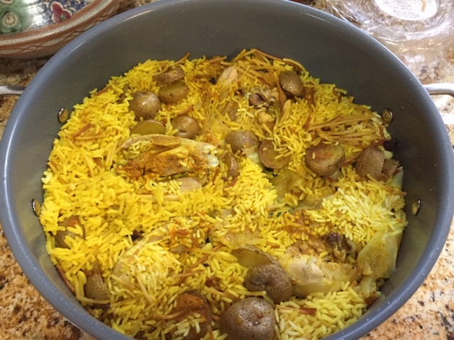 Heat 1/2 inch of oil in a large skillet, fry the vegetables [I used ½ head of cauliflower florets, zucchini, and small potatoes halved. You can use sliced carrots]. Drain on paper towels, lightly with salt. Add ¾ cup of broken (about 1” pieces) vermicelli to the same pan with oil; stir until browned, about 2 minutes. Add the drained rice and stir about 4 minutes. Add 1 tbsp salt, 1/2 tsp black pepper, 1 tsp turmeric, ¾ tsp cinnamon, ½ tsp allspice, ¼ tsp ground cloves, and 3 grated cloves of garlic, and cook, stirring, until very fragrant.