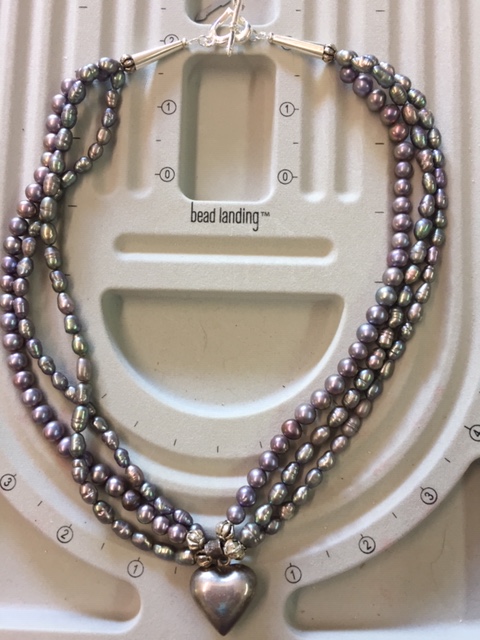 I enjoy working with pearls to see what I can assemble and then what to wear them with. A while ago, when Daughter returned home, she cleaned out her jewelry box. One piece she relinquished was a puffy sterling heart. I thought grey pearls would set off the silver nicely. I had several types to choose from, of course all cultured. There were some freshwater pearls and some spherical, regular shaped pearls. I decided on three strands to off-set the heart with silver-tone spacer beads at the center. The strands meet at the ends with another spacer and silver cones, closing with a heart-shaped toggle.