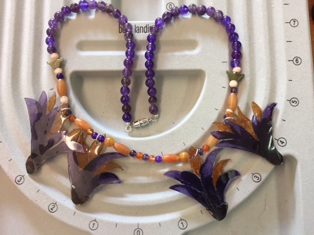 A while ago, Kaitlin, my co-worker and partner in craft crime, and I spent an afternoon creating a variety of fun shapes with shrinky-dinks (see Sept. 8 post). Mine sat in a small zip-lock bag on my jewelry table calling to be put into something pretty. I had several sets – the usual hand of Fatima and pomegranates (still waiting), three quasi chrysanthemums, and several free form flowers. I started with the chrysanthemums matched with coral tubular beads and small green glass beads to pick up the green leafs. I also added some of the green beads near the ends of the beads.