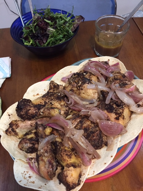 Palestinian Roast Chicken with Sumac and Red Onions (Mussakhan) is adapted from Yasmin Khan’s cookbook Zaitoun: Recipes from the Palestinian Kitchen, and was found in Saveur Magazine. It’s a tasty, savory chicken rich with onions with a touch of sweet. Maybe it’s easier to post the link than to list the directions: https://www.saveur.com/palestinian-roast-chicken-with-sumac-and-red-onions-recipe/. You can see that in place of pitas, I served this with tortillas (use what is on-hand).