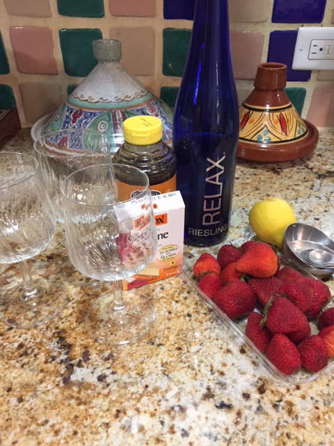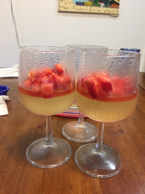The final adventure in cooking was just last Sunday, the eve of my birthday! It was a recipe I gleaned from Food & Wine Magazine for a gelée made with riesling (purchased with this dessert in mind in this case) – https://www.foodandwine.com/recipes/riesling-gelee-strawberry-conserve. I’ve already been playing with making gummies – with prosecco and mead (see April 27 & May 23 posts). The previous experiment with gummies were yummy. This one stands out as an (easy) elegant (and yummy) dessert using season berries. I’m sure you can use almost any berry for the same delicious result.