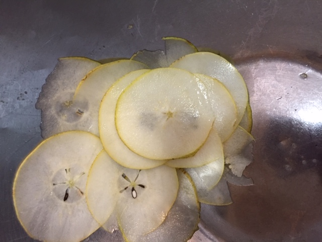 I’ve also been using what’s in the pantry or seasonal to make desserts. An easy dessert is a fruit galette, a pie with only the bottom crust (see Aug. 14, 2019 post). No recipe is needed, but for this pear galette, I was inspired by one for apple pie that called for slicing the fruit in cross section with a mandolin. That way, the star pattern formed by the seeds in the center stand out.