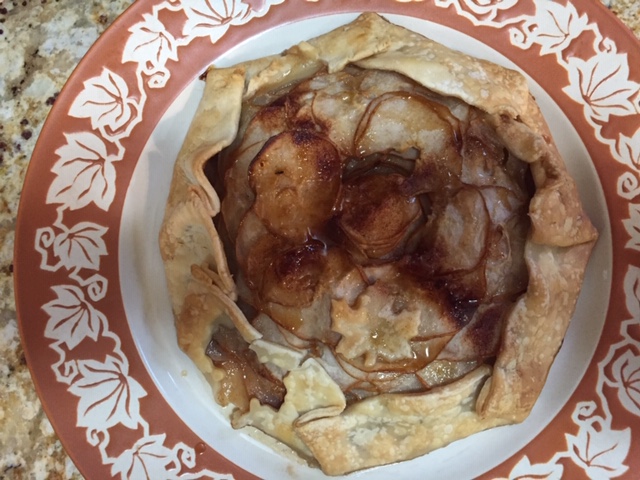 I sliced the pears. Spread a ready-made pie crust from the store on my Silpat and cookie tin. Pile the fruits in the center of the crust. Carefully fold the edges in; you can sprinkle the edges with sugar. Bake in a 385 F oven for about 30 minutes. Cool and eat. Although I usually use no sugar, cinnamon, etc., this time I topped the fruit with cinnamon sugar. You can adjust to your tastes, but you’ll find the fruit is sweet enough.