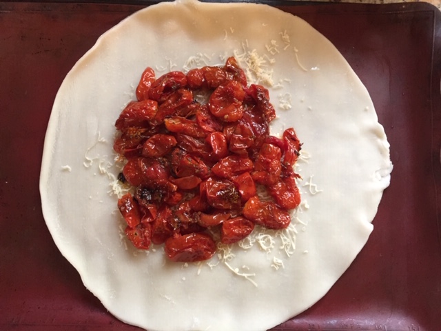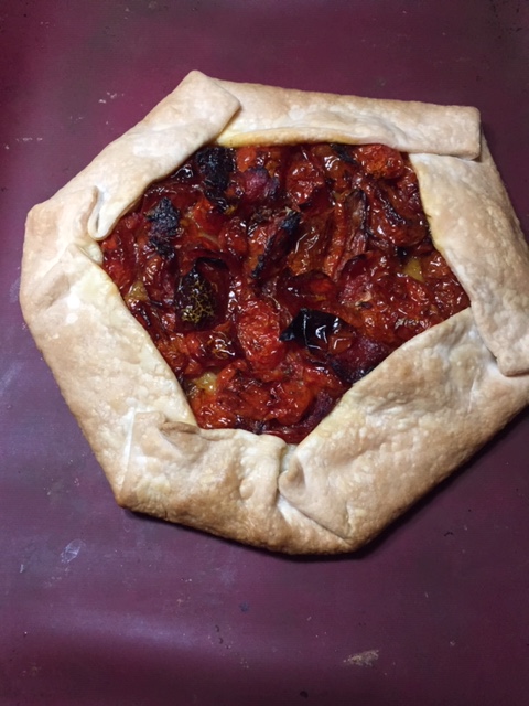 Cherry tomatoes. Daughter thought they were past their peak, so I halved them tossed in olive oil, thyme, and some salt to roast in a 375 degree F oven for about ½ hour. Next was to use them in a tomato galette, care of Bon Appetit (https://www.bonappetit.com/recipe/tomato-galette). I use a ready-made pie crust. I did not use the full amount of cheese, just grated Tillamook white cheese to cover to crust, then topped with the roasted tomatoes, and 2 thinly sliced garlic cloves. After folding in the edges, brush beaten eggs, or just water along the edges. Bake in a preheated 400 degree F oven for 55-65 minutes.