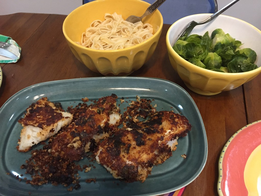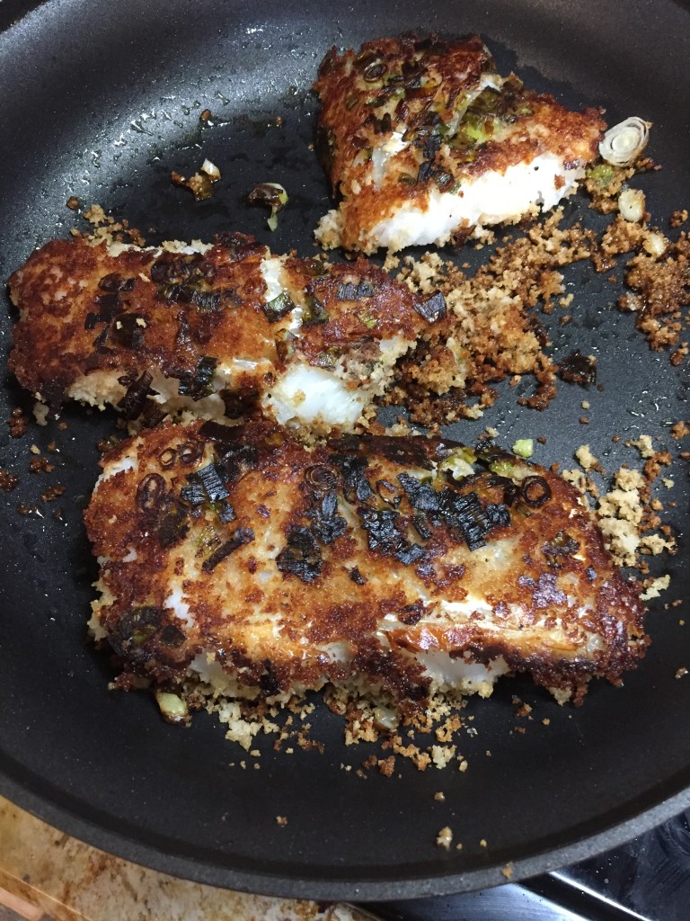Next the fish, 4 skinless 6-oz fillets. Season with salt and pepper, I dredged them in panko for the crunchy effect. Cook over a moderate high heat, turn only once, until golden outside, about 10 minutes total. A while ago, I made some scallion oil (https://food52.com/recipes/70013-scallion-oil-chinese-mother-sauce-1). I used it to cook the fish, added flavor. Serve with the aioli.