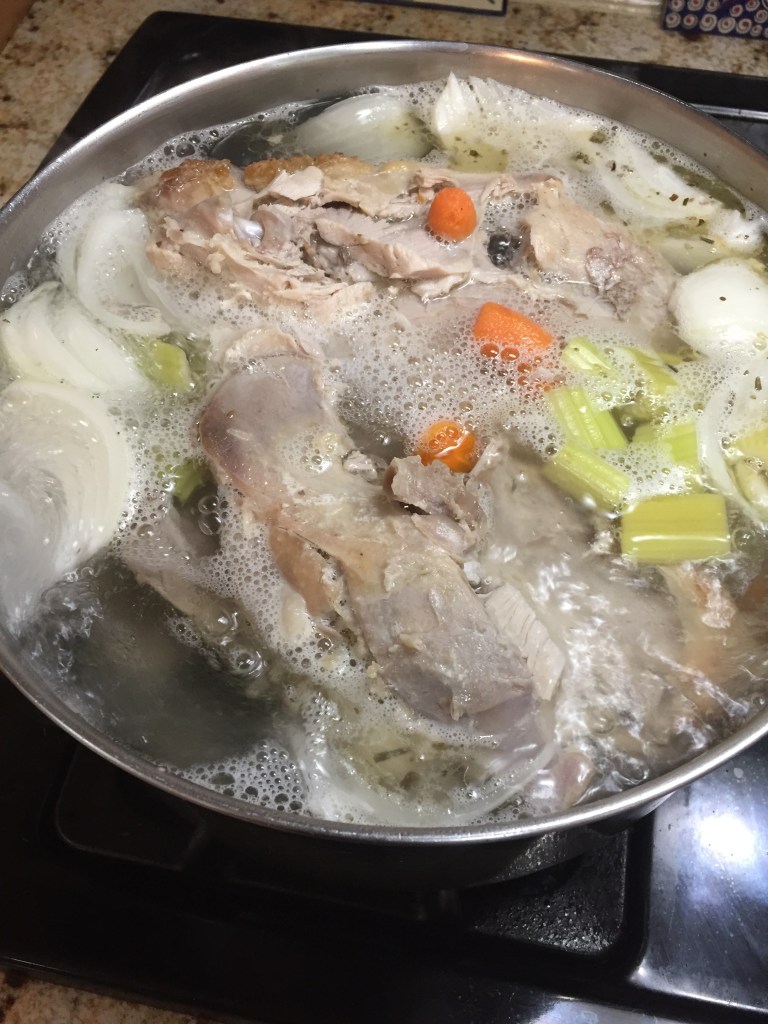 Put the carcass with 2 stalks of celery and 1 carrot, roughly chopped, and 1 quartered onion into 14 cups of water. I also put in a small chicken carcass from a recent meal. Bring to a boil. Reduce to simmer and cook til stock is reduced to about 8 cups (it took about 3 hours). Remove from the pan, when cooled take the meat and discard the bones. Strain the stock and discard the solids.